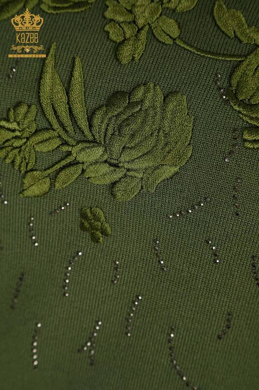 Tricots pour femmes en gros à motifs floraux pierre brodée à manches longues kaki - 16849 | KAZÉE