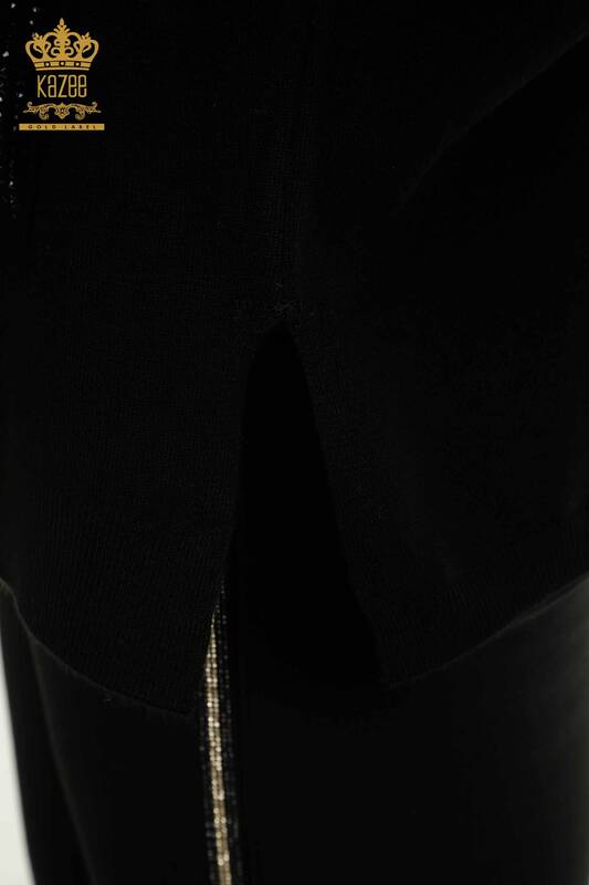 Pull en tricot pour femmes en gros avec poche brodée en pierre et col rond détaillé noir - 30623 | KAZÉE