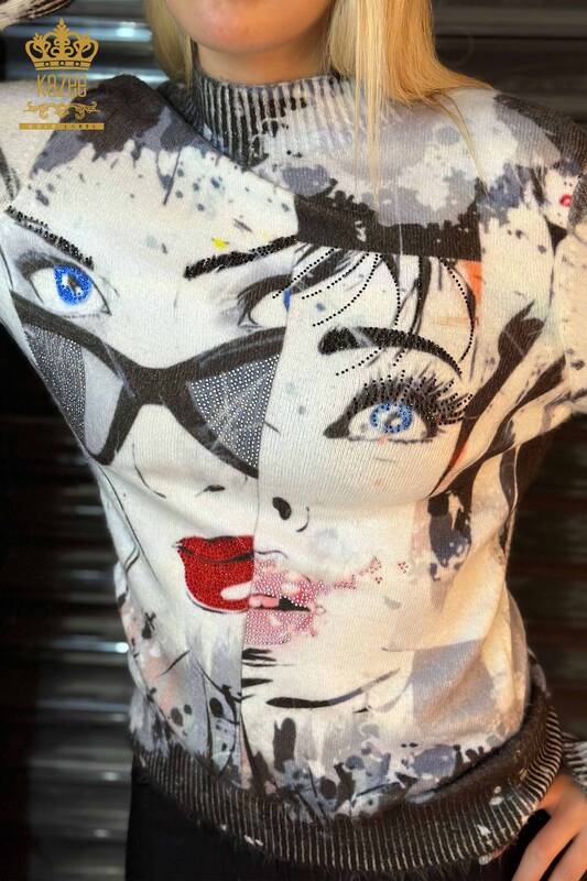 Grossiste Maille Pull Angora Impression Numérique Pierre Brodée Ecru - 18946 | KAZÉE