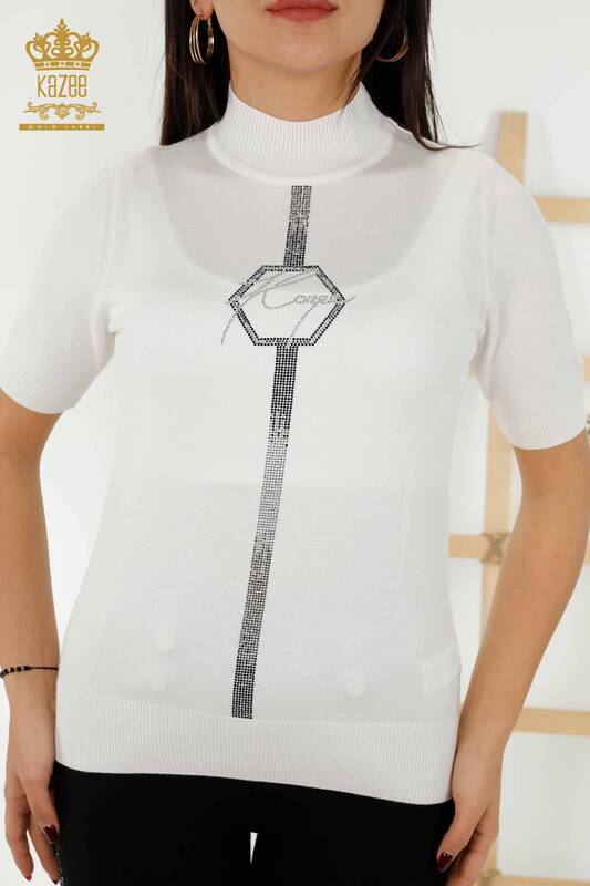 Grossiste Pull Tricot Femme Modèle Américain Pierre Brodée Ecru - 16639 | KAZEE