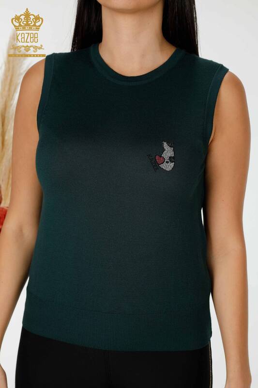 Grossiste Tricot Femme Motif Chat Sans Manches Pierre Brodée Vert Foncé - 16902 | KAZEE