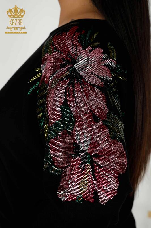 Vente en gros Pull en maille pour femme Pierre brodée sur l'épaule Détail floral Noir - 16133 | KAZEE