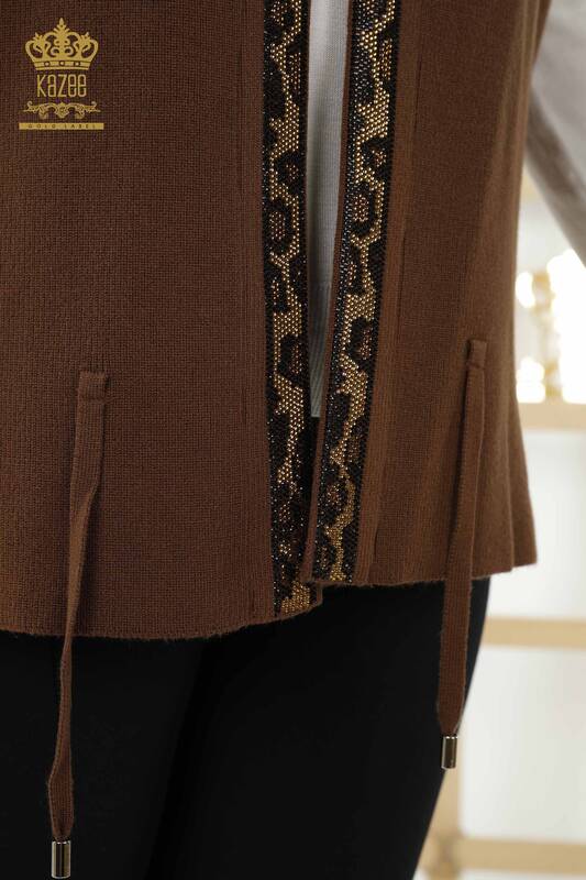 Grossiste Femme Gilet Court Pierre Brodée Motif Léopard Marron - 30311 | KAZEE