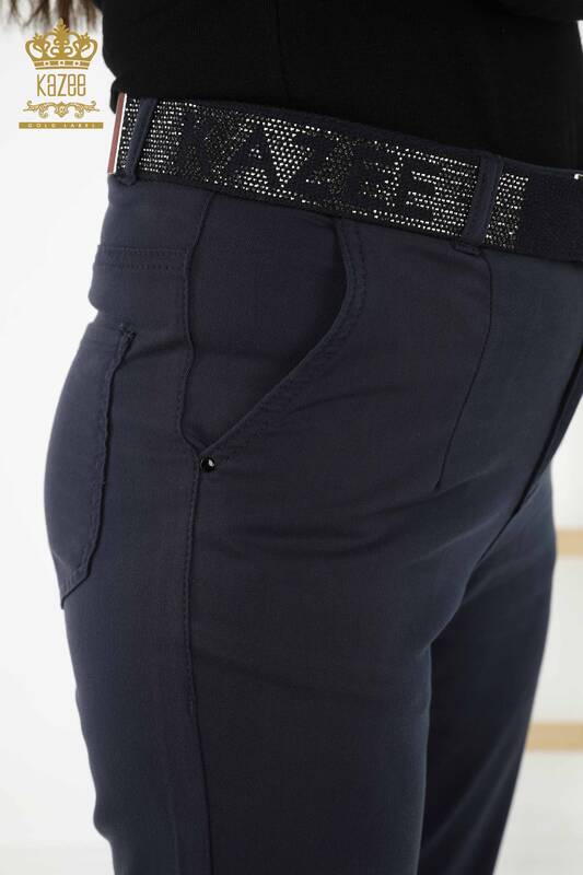 Grossiste Pantalon Femme Avec Poches Ceinture Pierre Brodée Bleu Marine - 3685 | KAZEE