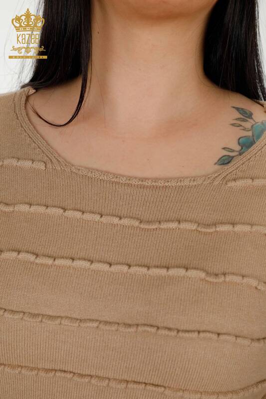 Grossiste Pull en Maille Femme Auto-Tissé Col Ras du Cou Beige - 30169 | KAZEE
