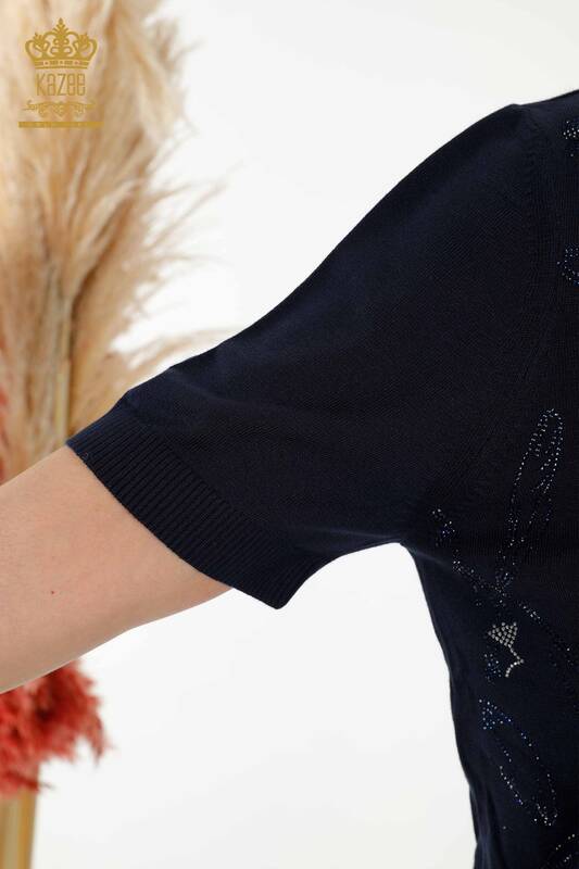 Vente en gros Pull Femme Tricot Feuille Motif Cristal Pierre Brodé Bleu Marine - 30240 | KAZEE