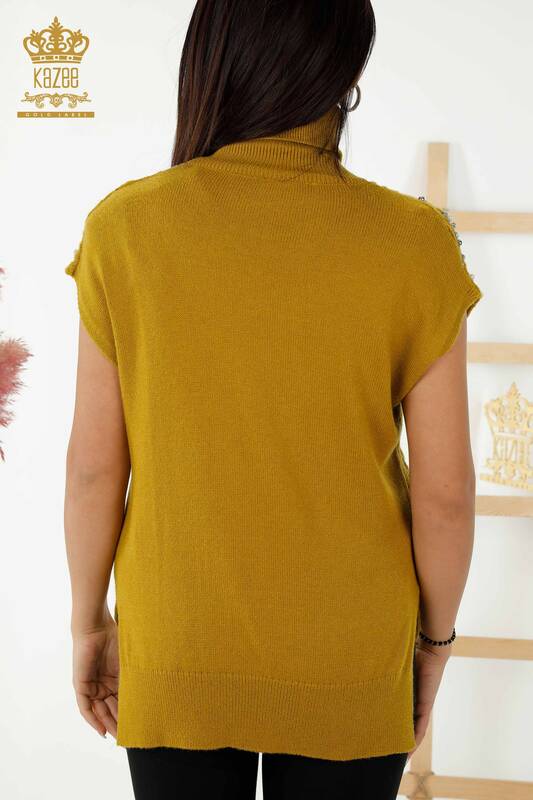 Grossiste Pull Femme Cristal Pierre Col Roulé Brodé Moutarde - 30242 | KAZEE