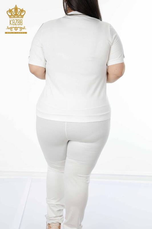 Grossiste Ensemble de Survêtement Femme Manches Courtes Pierre Poche Brodée Détaillée Ecru - 17392 | KAZEE