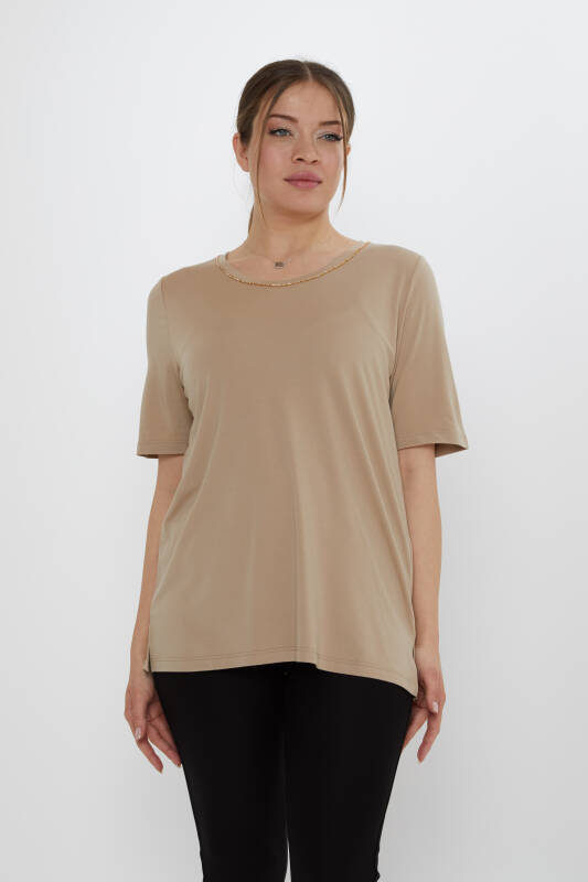 Блузка с воротником и отделкой в виде камня, короткий рукав, бежевый - 80030 | KAZEE (Набор из 3 шт. M-L-XL)