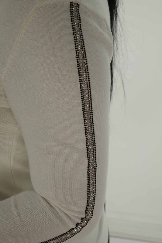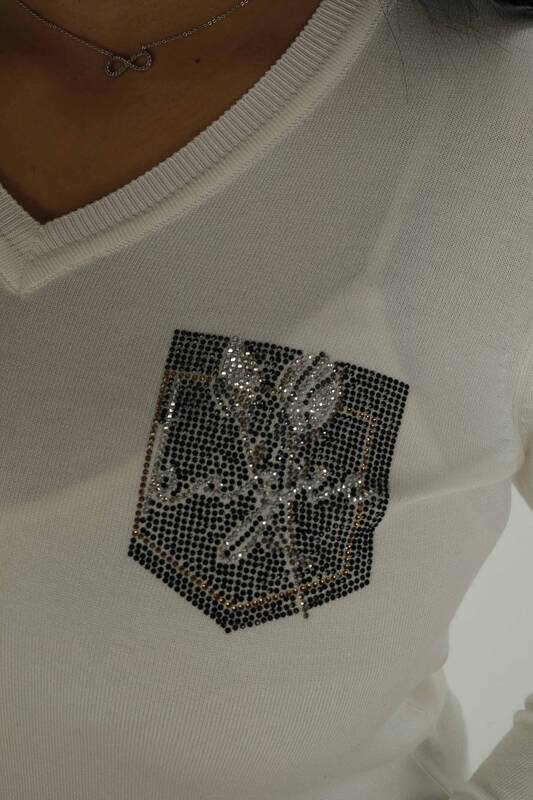 Langarm-Strickwaren mit V-Ausschnitt und Steindetail Ecru - 30751 | KAZEE