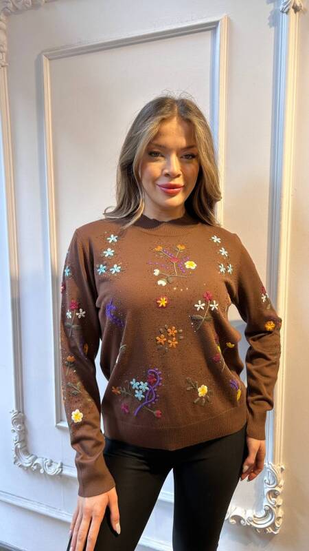 Вязаный свитер с цветочным узором и отделкой из камней, кофейного цвета - 32168 | KAZEE (комплект из 3 предметов L-XL-2XL)