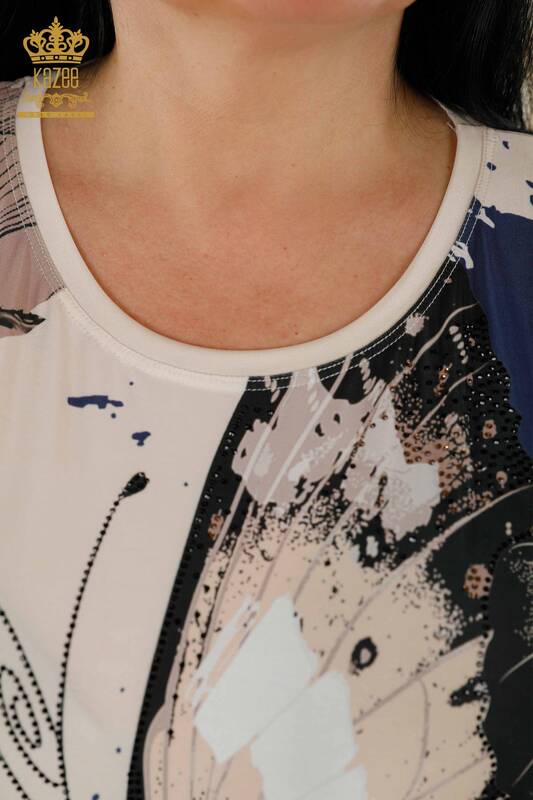 Wholesale Women's Blouse Butterfly Patterned Stone Embroidered Beige - 77900 | KAZEE