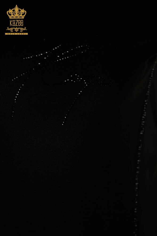 Wholesale Women's Blouse Crystal Stone Embroidered Short Sleeve Tulle Detail Black - 79232 | KAZEE