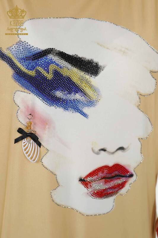 Wholesale Women's Blouse Digital Print Stone Embroidered Short Sleeve Saffron - 77755 | KAZEE