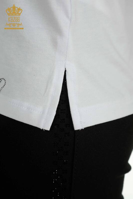 Wholesale Women's Blouse Stone Embroidered Crew Neck White - 79565 | KAZEE