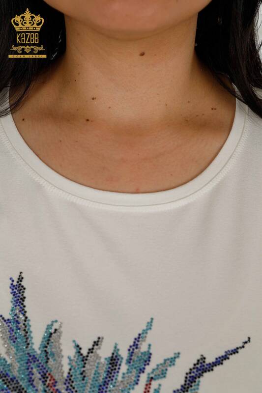 Wholesale Women's Blouse Floral Pattern Stone Embroidered Short Sleeve Ecru - 79369 | KAZEE