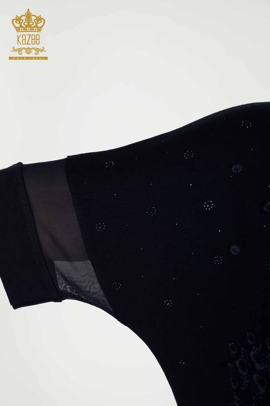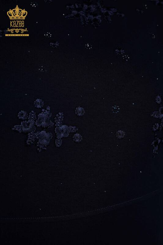 Wholesale Women's Blouse Short Sleeve Stone Embroidered Floral Pattern Navy Blue - 79087 | KAZEE