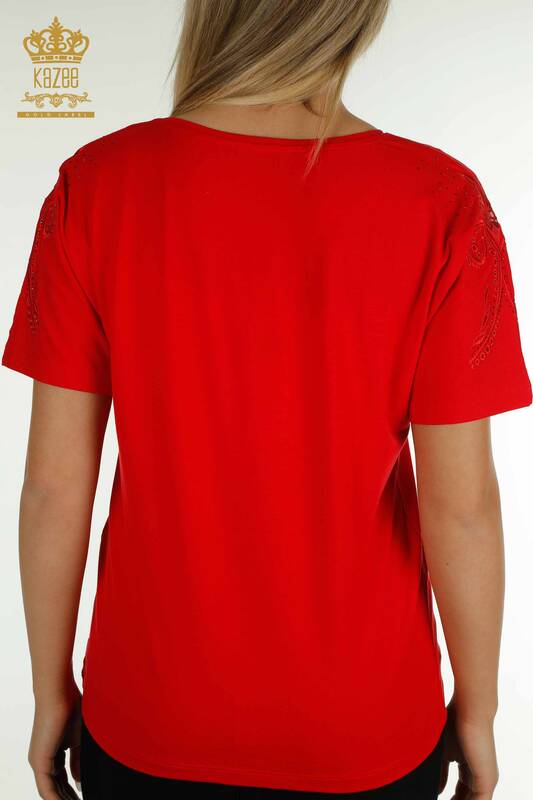 Wholesale Women's Blouse Floral Pattern Short Sleeve Stone Embroidered Red - 79093 | KAZEE