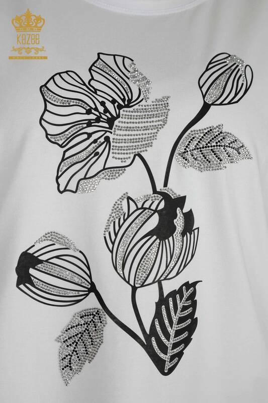 Wholesale Women's Blouse Flower Embroidered Crystal Stone Embroidered Short Sleeve White - 79459 | KAZEE