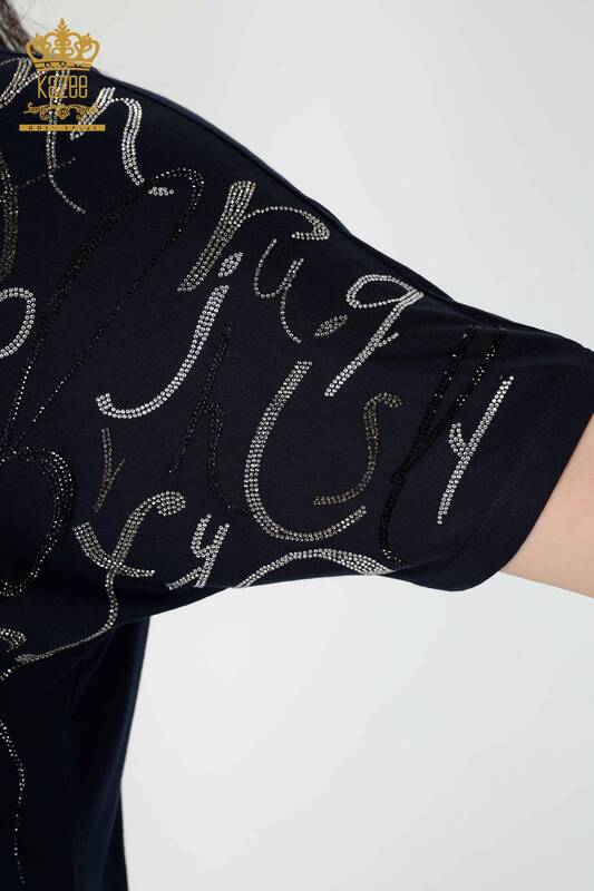 Wholesale Women's Blouse Crystal Stone Embroidered Letter Detailed Navy - 78833 | KAZEE