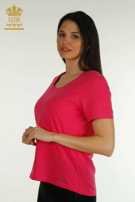 Wholesale Women's Blouse Stone Embroidered Short Sleeve Logo Fuchsia - 79560 | KAZEE