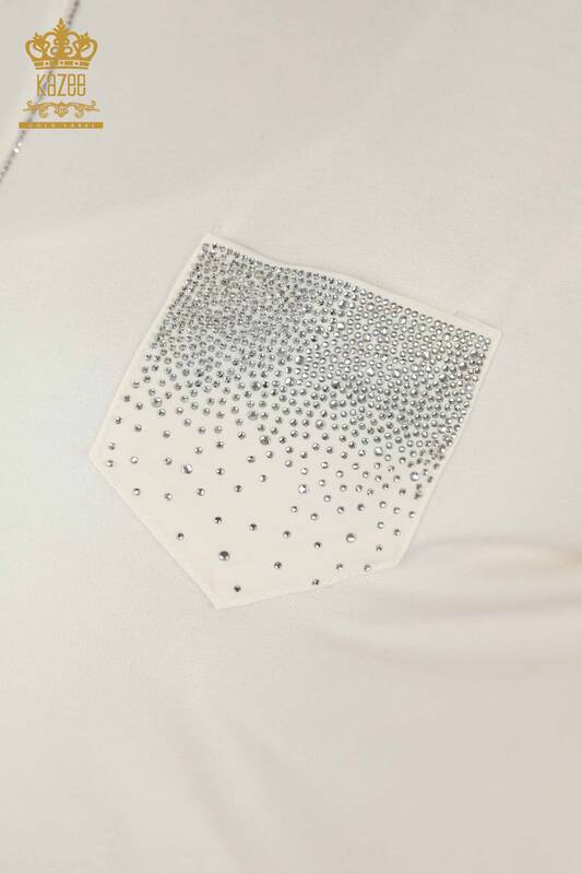 Wholesale Women's Blouse Pocket Stone Embroidered Crew Neck Ecru - 79222 | KAZEE