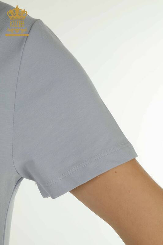 Wholesale Women's Blouse Short Sleeve Stone Embroidered V-Neck Blue - 79561 | KAZEE