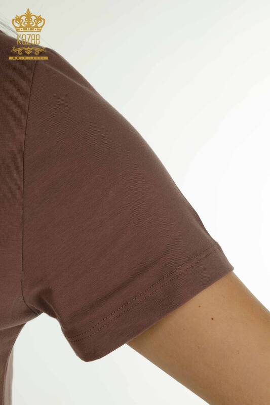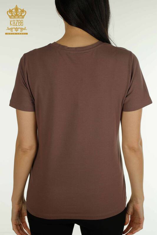 Wholesale Women's Blouse Short Sleeve Stone Embroidered V-Neck Brown - 79561 | KAZEE