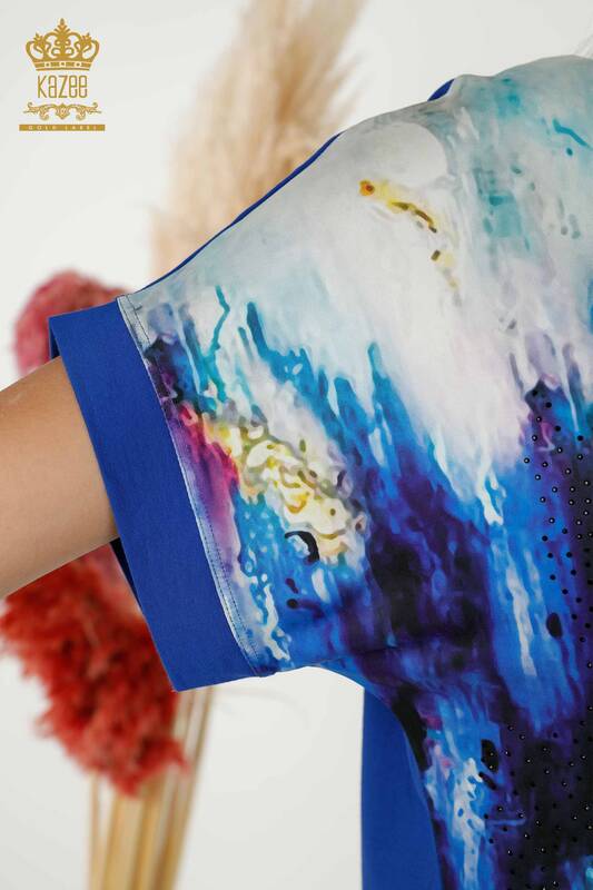 Wholesale Women's Blouse Short Sleeve Stone Embroidered Digital - 12087 | KAZEE