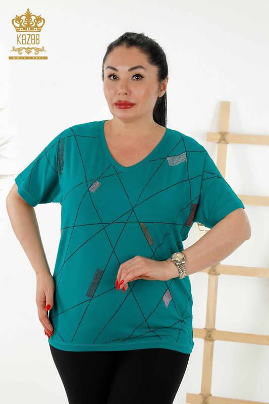 Wholesale Women's Blouse Stone Embroidered Patterned Short Sleeve Green - 79288 | KAZEE