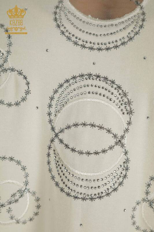Wholesale Women's Blouse Short Sleeve Patterned Stone Embroidered Tulle Detailed Ecru - 79094 | KAZEE