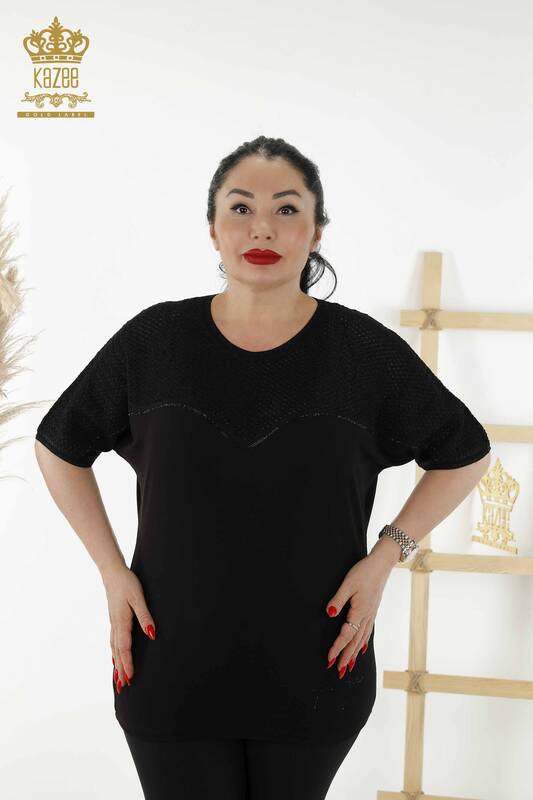 Wholesale Women's Blouse Stone Embroidered Short Sleeve Crew Neck Black - 79235 | KAZEE