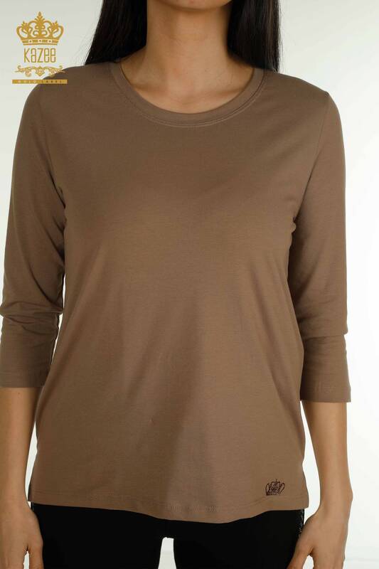 Wholesale Women's Blouse Stone Embroidered Crew Neck Light Brown - 79565 | KAZEE