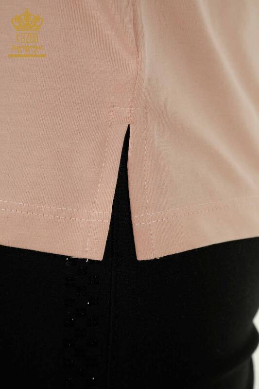 Wholesale Women's Blouse Stone Embroidered Crew Neck Powder - 79565 | KAZEE