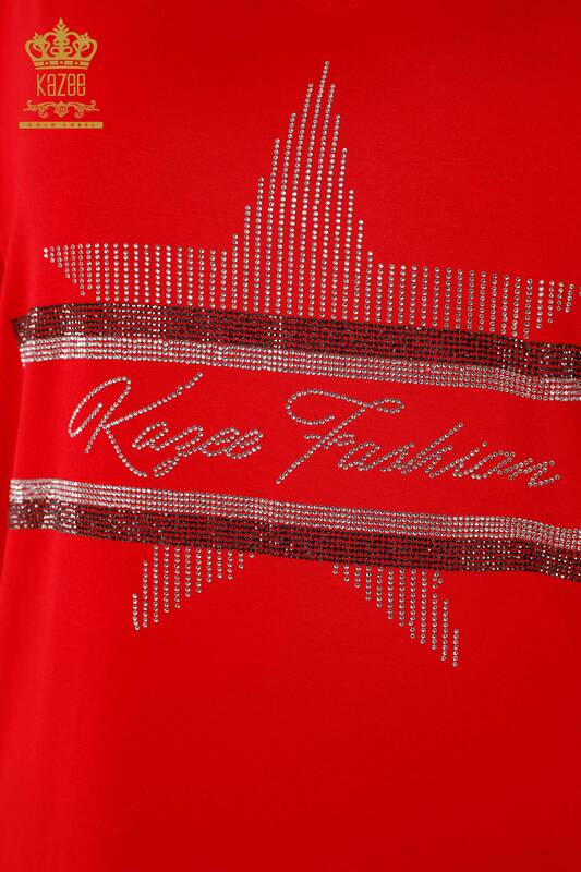 Wholesale Women's Blouse V Neck Short Sleeve Stone Embroidered Red - 78882 | KAZEE