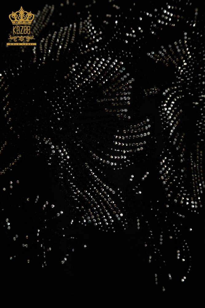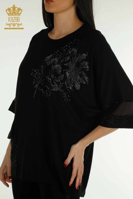 Wholesale Women's Blouse Floral Pattern Stone Embroidered Tulle Detail Black - 79298 | KAZEE