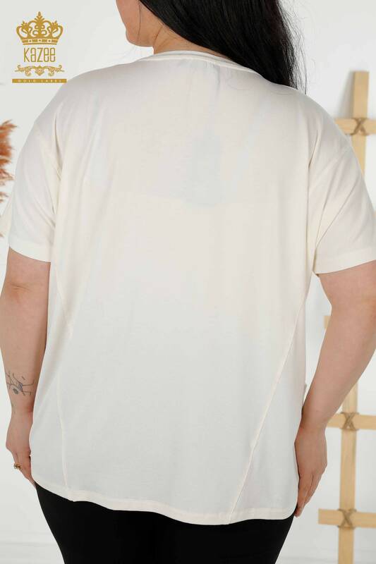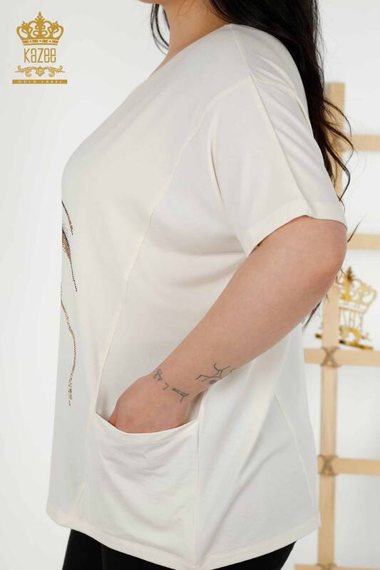 Wholesale Women's Blouse Short Sleeve Patterned Stone Embroidered Two Pockets Ecru - 79294 | KAZEE