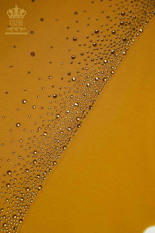 Wholesale Women's Blouse Two Pockets Short Sleeve Stone Embroidered Saffron - 79293 | KAZEE