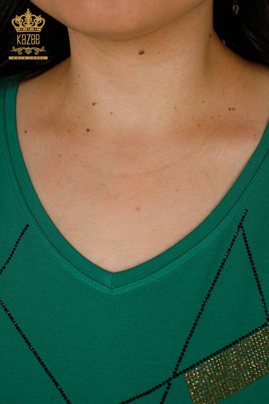 Wholesale Women's Blouse V Neck Stone Embroidered Short Sleeve Green - 79320 | KAZEE