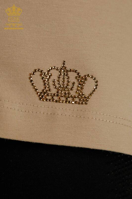 Wholesale Women's Blouse V-Neck Stone Embroidered Logo Beige - 79564 | KAZEE