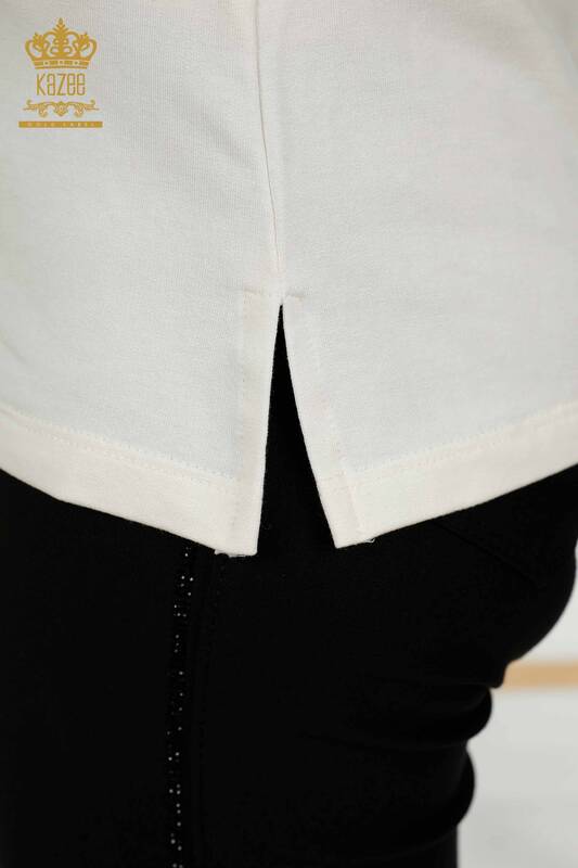 Wholesale Women's Blouse V Neck Stone Embroidered Ecru - 79309 | KAZEE