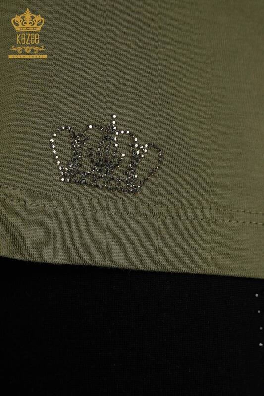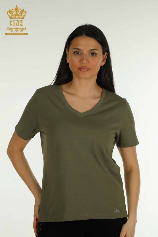 Wholesale Women's Blouse V-Neck Stone Embroidered Logo Khaki - 79564 | KAZEE