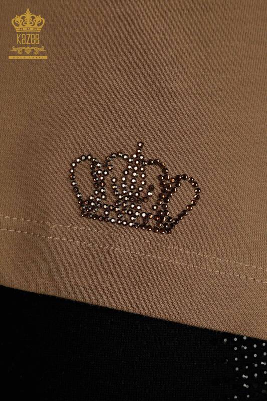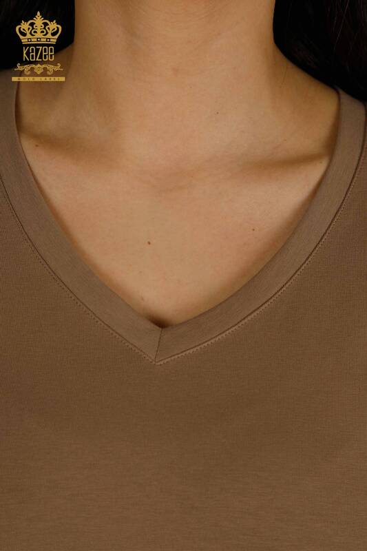 Wholesale Women's Blouse V-Neck Stone Embroidered Logo Light Brown - 79564 | KAZEE