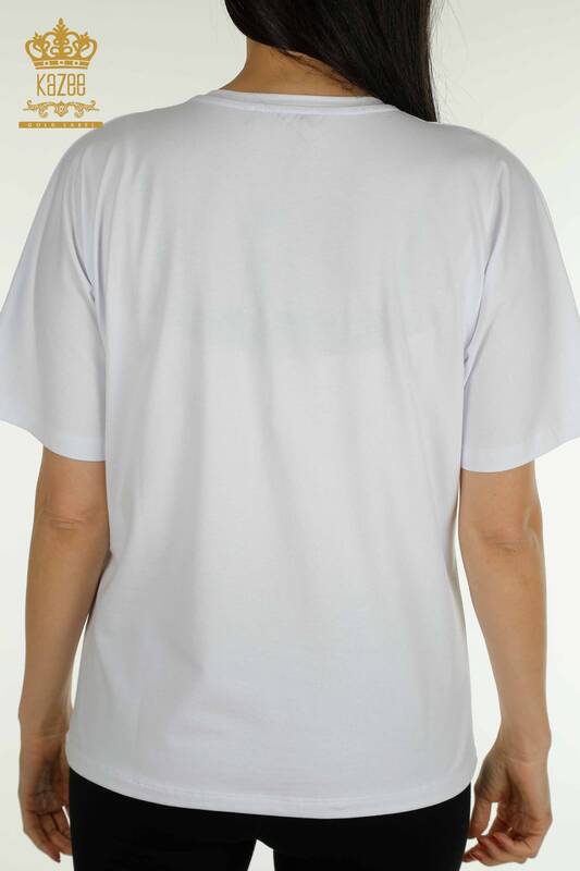 Wholesale Women's Blouse Zebra Striped Stone Embroidered Short Sleeve White - 79457 | KAZEE