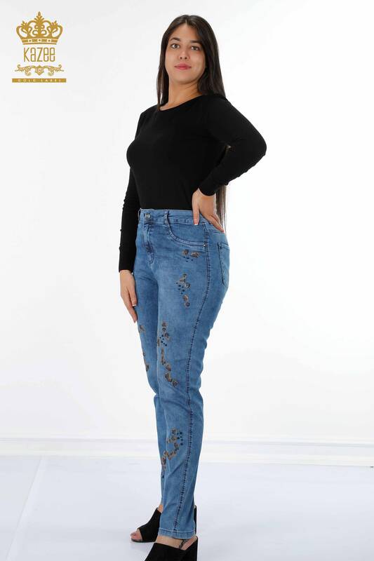 Wholesale Women's Jeans Patterned Colored Stone Embroidered Pockets - 3606 | KAZEE