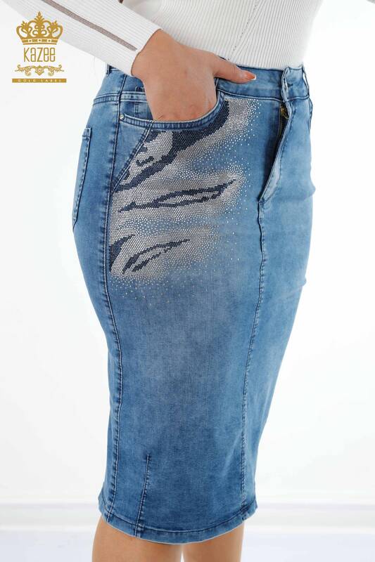 Wholesale Women's Denim Skirt Colored Stone Embroidered Patterned Viscose - 4185 | KAZEE