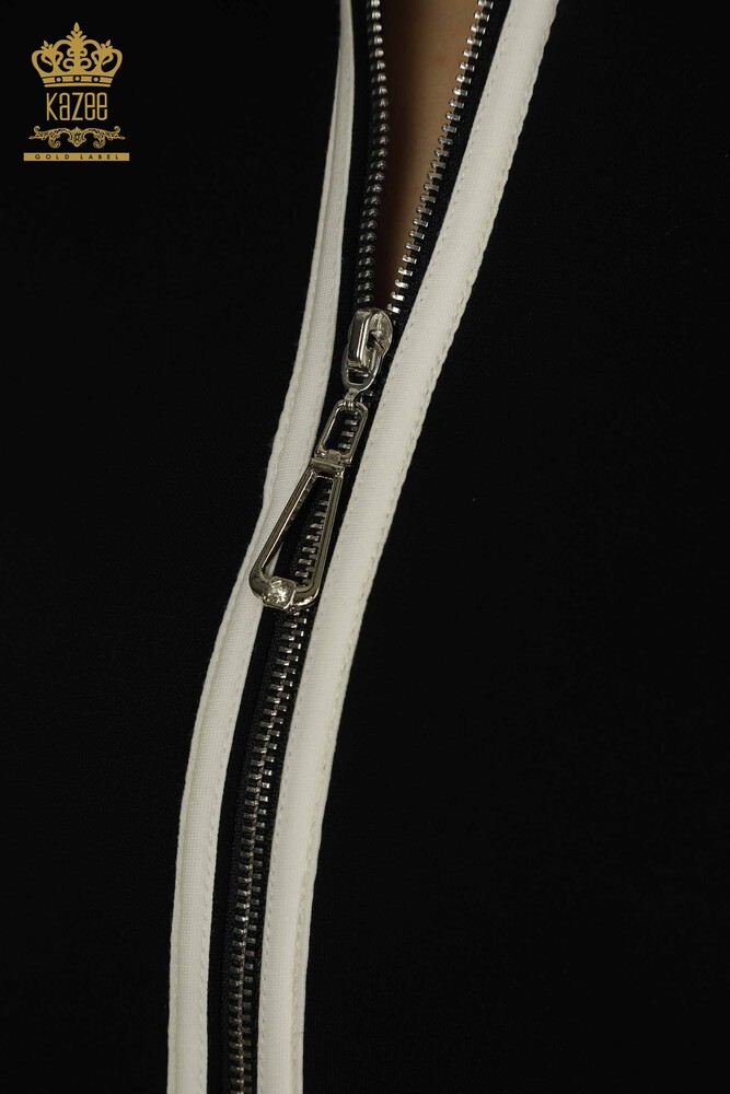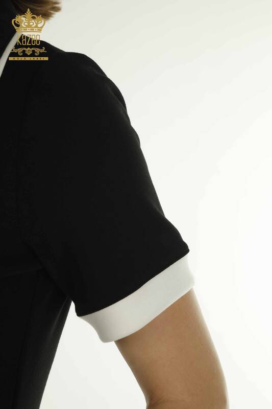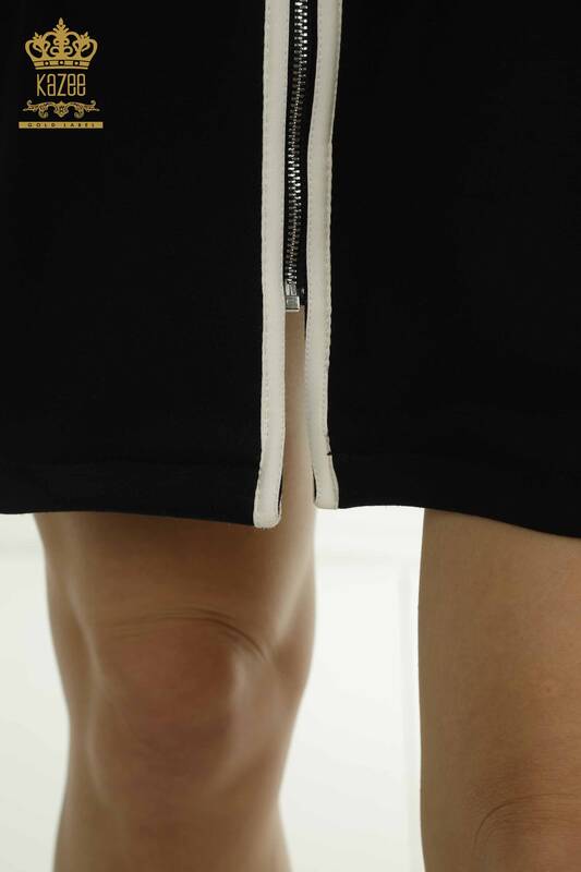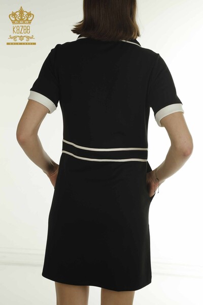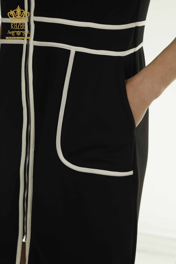 Wholesale Women's Dress Zippered Two Pockets Short Sleeve Black Ecru - 17722 | KAZEE