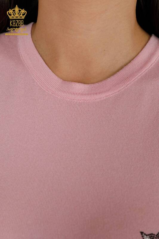 Wholesale Women's Knitwear Cat Patterned Sleeveless Stone Embroidered Pink - 16902 | KAZEE