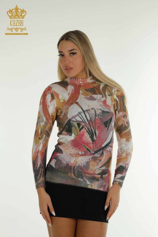 Wholesale Women's Knitwear Sweater Angora Flower Patterned Long Sleeve Stone Embroidered Digital - 40043 | KAZEE