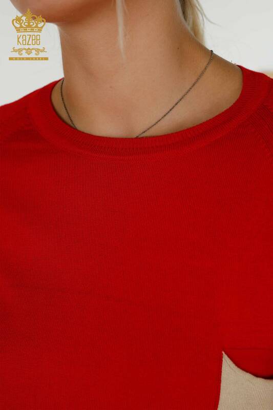 Wholesale Women's Knitwear Sweater Colored Pocket Crew Neck Red - 30108 | KAZEE